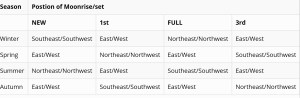 - The moon’s orbit keeps wobbling around earth which is why not every time Rahu and Ketu get aligned in line with Sun and moon on a no moon or a full moon day. This is also the reason that Moon keeps changing its position in the sky during different weather conditions basis the tilt of earth. The table below shows a trend. In other words, the moon scans the entire sky over a period of twelve months and from our mind and body perspective, its varying effect is felt on the entire body (or say brain) unlike Sun which is more or less fixed in its time or rise and direction of rising and setting.