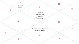 The figure here shows the birth chart of a person where he/she was born when zodiac number one which is Aries (that represents energies of Mars planet) was rising in the east thereby imparting Mars type wiring to the deepest layer of the person which is why it is called as the first house and thus the rising zodiac of the person in question. Being deepest, first house depicts the deepest constitution and the deepest personality of the person (or say deepest dosha in the language of Ayurveda). Similarly, the second house represents the energy of the second zodiac that the person faces which in above example has 2nd zodiac. Thus zodiacs also represent different layers of time with each timeslot having a different energy.